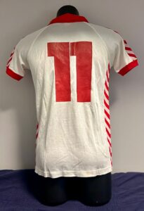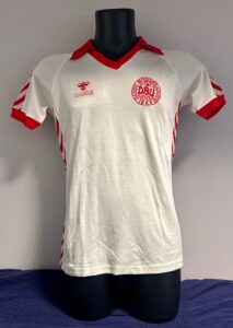 Quella in presentazione è una maglia del 1980 da trasferta a manica corta. Sempre prodotta dall’azienda tedesca, poi divenuta danese, Hummel e molto semplice, con le bande biancorosse trasversali quasi a formare un contorno nella parte esterna della maglia. Il colletto è rosso ed è morbido, così come sono rossi i bordi manica. Nella parte centrale del fronte maglia troviamo, a sinistra, lo stemma della federazione danese DBU, che sta per “Dansk Boldspil Union” con la data di fondazione risalente al 1889. Dalla parte opposta troviamo lo stemma della Hummel, simile ad un’ape stilizzata.