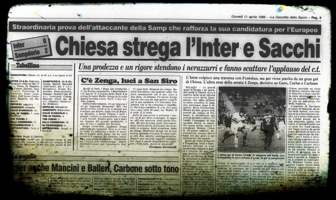 Non si poteva, insomma, scegliere il momento migliore per trascinare la propria squadra contro una big con due prodezze e tante giocate significative. La Sampdoria cavalca l’onda favorevole e vive il periodo magico. Infatti, con il successo sull’Inter incasella il terzo consecutivo. Di magico, però, non è solo il trend positivo della squadra di Eriksson ma il tutto accompagnato dal gesto del primo gol di Chiesa. Qualcosa di meraviglioso: mentre punta Bergomi sa già dove avrebbe messo quella palla. Si crea lo spazio per il sinistro e voilà. La finezza, la dolcezza nel calciare senza troppo rumore finisce sotto l’incrocio. Un gol da cartolina che fotografa al meglio il potenziale e le gesta da vero campione. Un attaccante veloce, imprevedibile con la capacità di tirare allo stesso modo con entrambi i piedi.