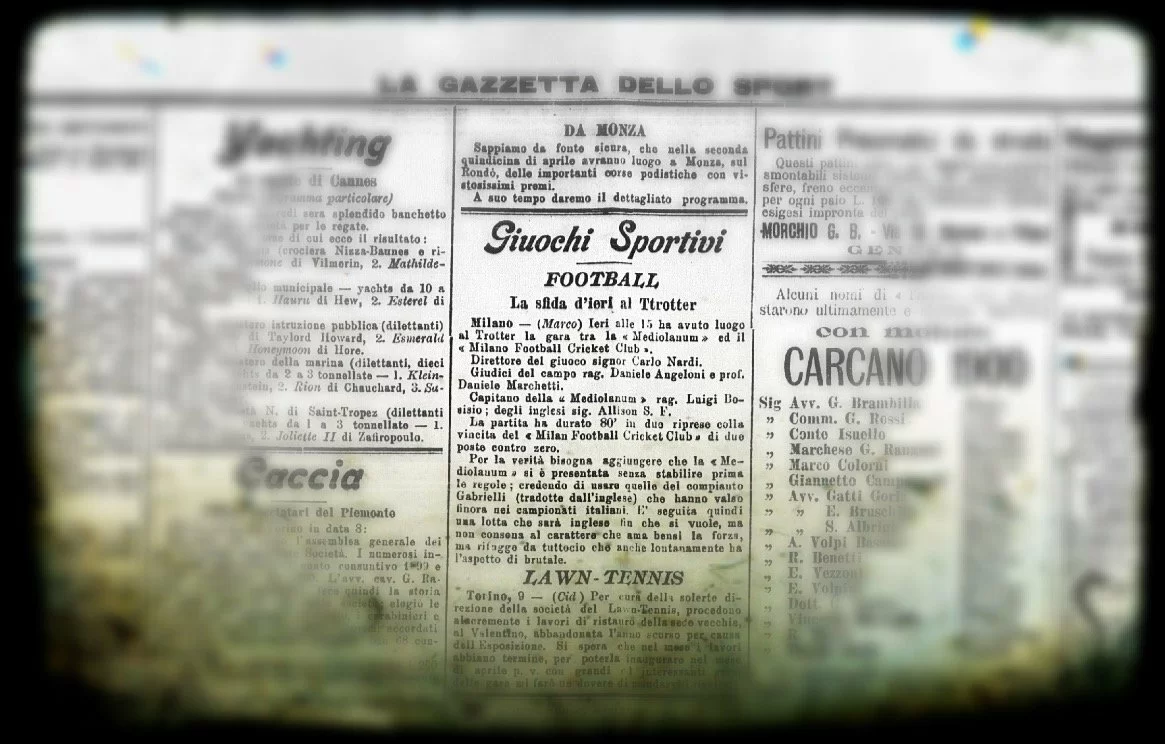 GLIEROIDELCALCIO.COM – “Ieri alle 15 ha avuto luogo al Trotter la gara fra la “Mediolanum” ed il “Milano Football Cricket Club”: Direttore del giuoco il signor Carlo Nardi. Giudici del campo ragionier Daniele Angeloni e professor Daniele Marchetti. Capitano della “Mediolanum” ragionier Luigi Bosisio; degli inglesi signor Allison S. F.