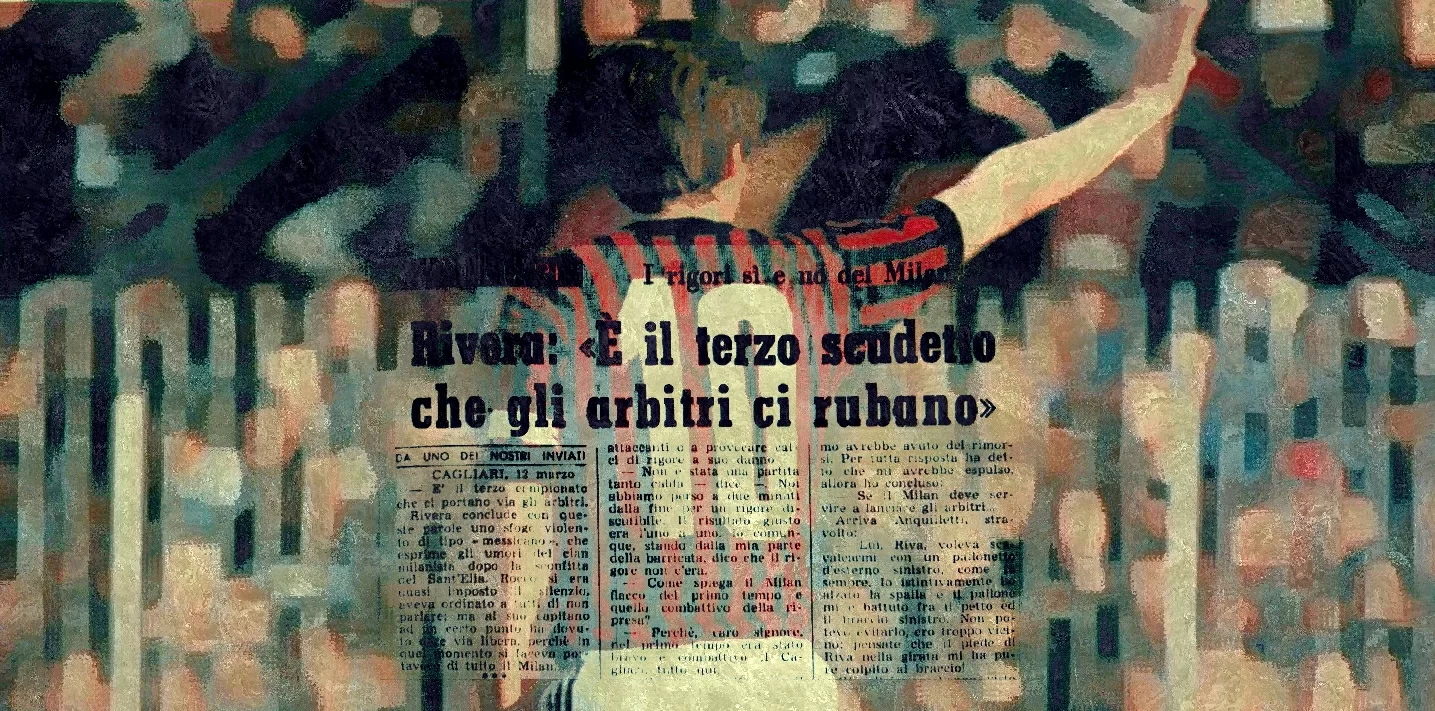 Al vantaggio di Gori rispose la caparbietà sotto porta di Bigon. Un 1 a 1 durato fino al minuto 87′, quando la comodità di un pareggio annunciato lasciò il posto all’inizio di una polemica rimasta nella storia. Riva, cercando di liberarsi in area, aveva colpito il braccio di un difensore milanista. Un tocco involontario che però venne sanzionato con il rigore dall’arbitro Michelotti. Stessa situazione di Torino ed ennesima svista contro il Milan.