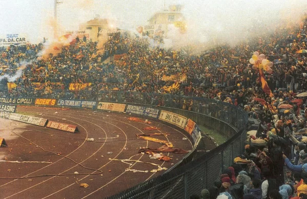 “La vecchia arena pisana s’è riempita per tre quarti di bandiere giallorosse e così stipata ha riecheggiato i cori dell’Olimpico ad un volume mai ascoltato. Quando i giallorossi sono usciti sul prato per la rituale ispezione, l’esplosione di tifo è stata travolgente. Dario Bonetti… s’è tolto la cravatta e l’ha gettata in mezzo al pubblico. È tornato di corsa verso gli spogliatoi avvolto in una sciarpa giallorossa, poi l’ha roteata a lungo sopra la testa scandendo il coro, e infine l’ha baciata suscitando il delirio” (Cit. Stampa Sera, 14 aprile 1986).