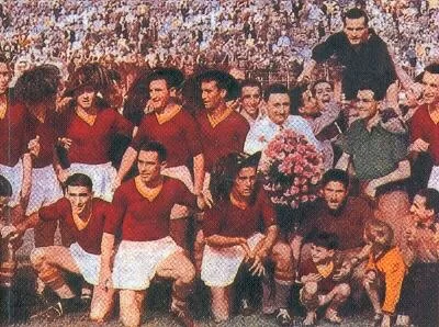Un capolavoro, una sorta di affresco per quei due cuori che in questo giorno battono forte forte. Sono riusciti in qualche modo ad urlare insieme a tutto lo stadio. Sul campo la partita va come deve andare, come è giusto. Non importa se giocata bene o male. I giocatori sono emozionati, sentono il peso della responsabilità. Il boato al 21′ per il gol di Cappellini, che di testa raccoglie una punizione di Jacobini, scaccia le paure. Poi il gol di Borsetti con un tiro al volo al 35’ regala la tranquillità, ma soprattutto, regala lo Scudetto. Un “titolo” che interrompe l’egemonia delle squadre del Nord: “Cadevano con la vittoria della Roma i vecchi pregiudizi geografici, che ricordavano ancora i tempi in cui l’Italia calcistica era divisa nelle leghe Sud e Nord. Questo insegnava l’immenso tripudio che si scatenò allo Stadio il pomeriggio del 14 giugno 1942; quando, appena conclusa la vittoriosa partita col Modena, la folla invase festosamente il prato. Grida, lacrime e mulinelli di gioia. E sopra tutto un fantastico sventolio di bandiere e striscioni giallorossi, una grande parata di osanna…Indimenticabile giornata; entusiasmo che riempì gli occhi e i cuori, mentre sull’onda dei ricordi tornavano le patetiche note della canzone testaccina: Campo Testaccio, c’hai tanta gloria, nessuna squadra ce passerà…” (Cit. “Storia Illustrata della Roma”, Olimpia Editrice, pubblicazione settimanale del 1953). Ma come se non bastasse questa giornata ci regala ancora un’altra bella immagine: la foto dei neo campioni d’Italia con Amadei, Andreoli, Borsetti, Coscia, Jacobini e Pantò con il cappello piumato dei Bersaglieri. In camicia bianca, e fiori in mano, il Presidente Bazzini e il mitico Vincenzo Biancone con il labaro sociale a mostrare i colori della vittoria, il giallo e il rosso.