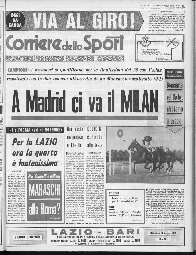 Il 15 Maggio si gioca il ritorno in Inghilterra, e se all’andata Law aveva costretto Rivera ad uscire, all’Old Trafford il difensore inglese non sarà da meno, ma il colpo del tentato KO arriverò dal pubblico, dal quale arriva un oggetto metallico che causa un trauma cranico a Cudicini che rimane comunque in campo.