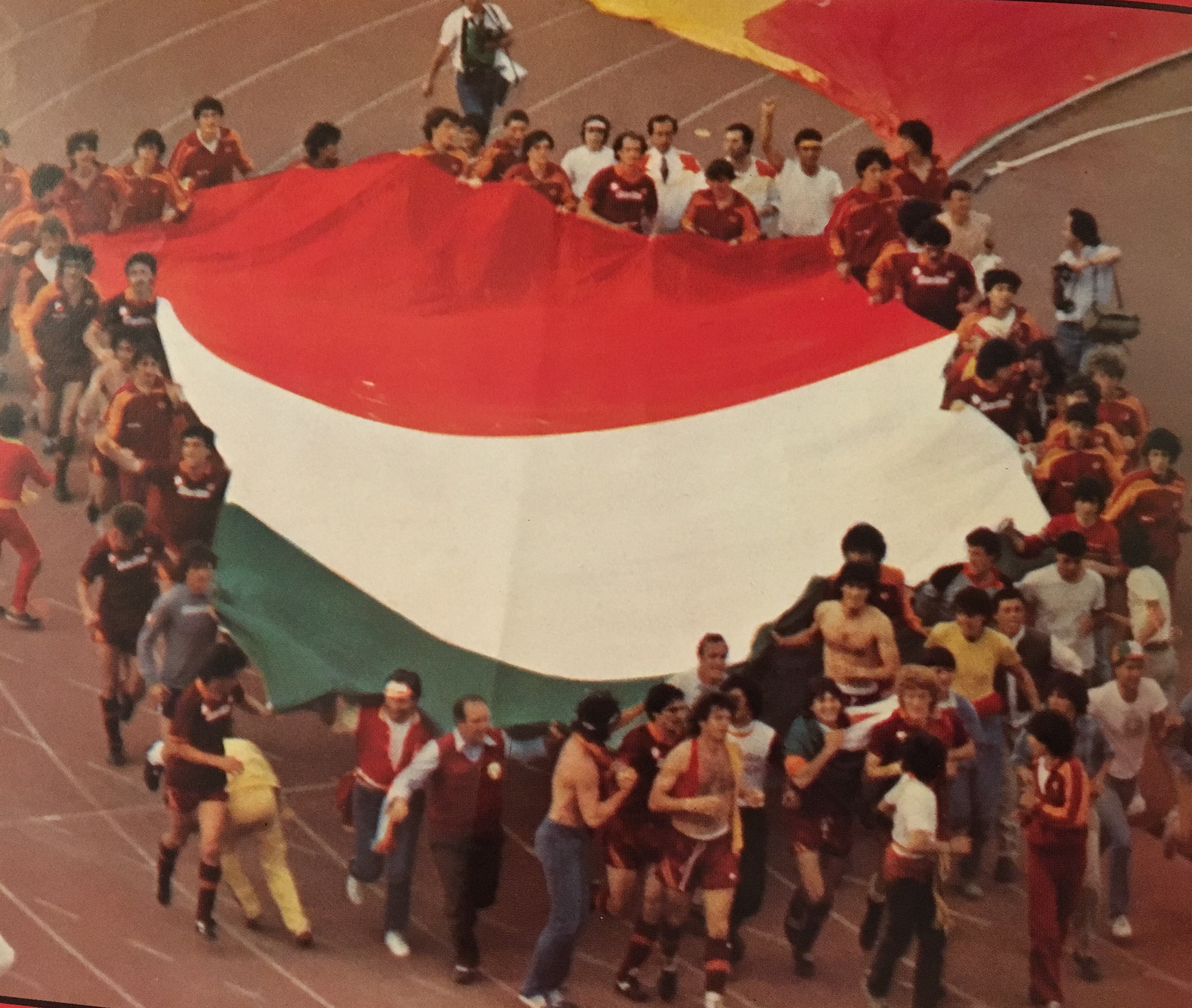 conteggio sicuramente approssimato per difetto abbiamo contato 30 striscioni in Tevere numerata, 52 in non numerata, 61 in curva Nord, 83 in curva Sud e tanti altri in Monte Mario. Di bandiere ce ne saranno state non meno di ventimila, una ogni quattro spettatori, ed era uno spettacolo al limite commovente vederle sventolare tutte insieme mentre, negli ozii del prepartita, gli altoparlanti mandavano gli inni più amati dalla tifoseria“ (Cit. Il Messaggero, 16 maggio 1983).