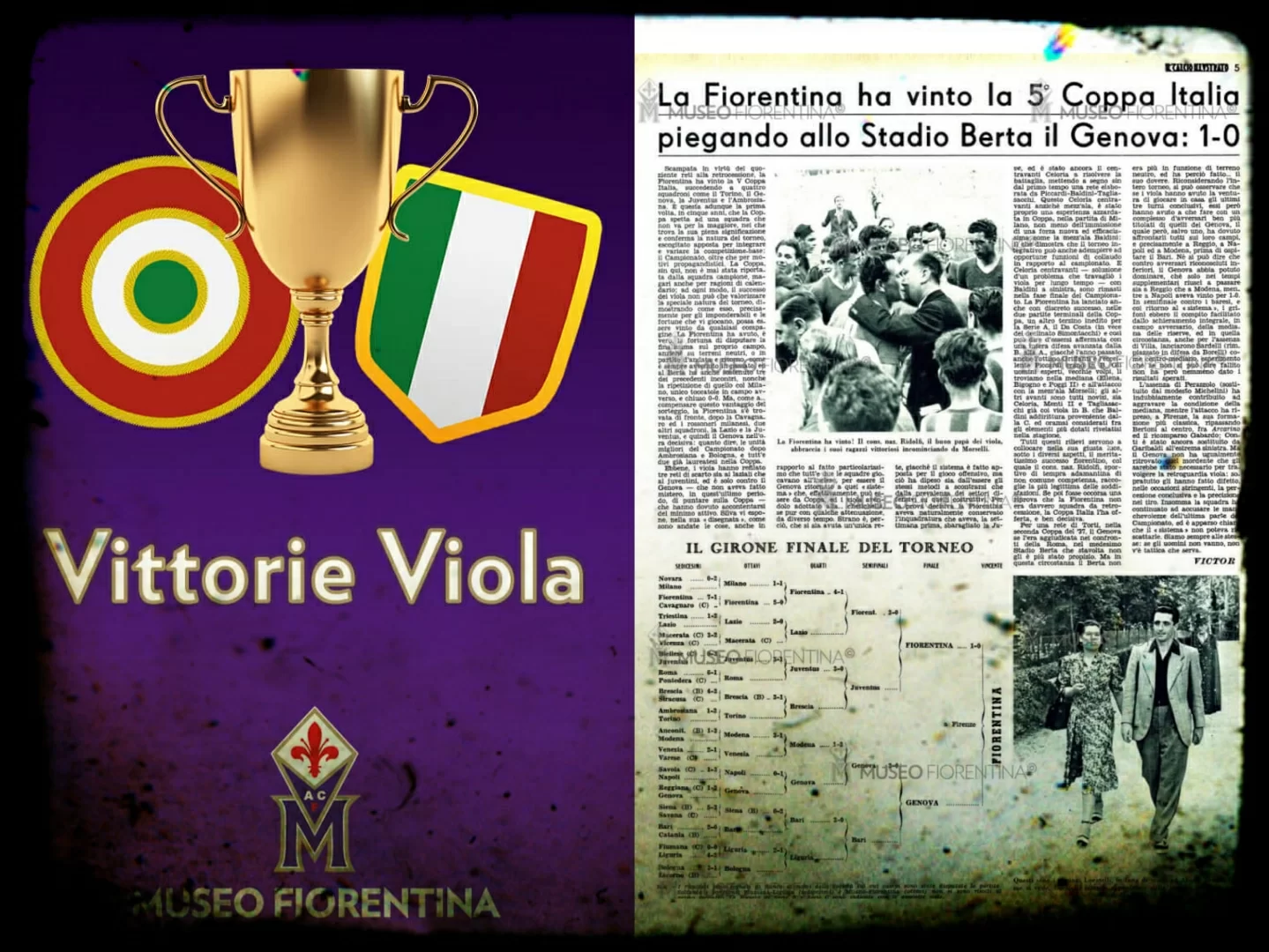 […] La Fiorentina ha completato la sua mirabile condotta in Coppa Italia, battendo di misura il Genova ed assegnandosi così l’ambito trofeo. Se i viola sono stati favoriti dal fatto di giocare nel loro Stadio, non è meno vero che è la prima volta che una squadra di primissimo piano riesce ad affermarsi nella tutt’altro che facile prova.