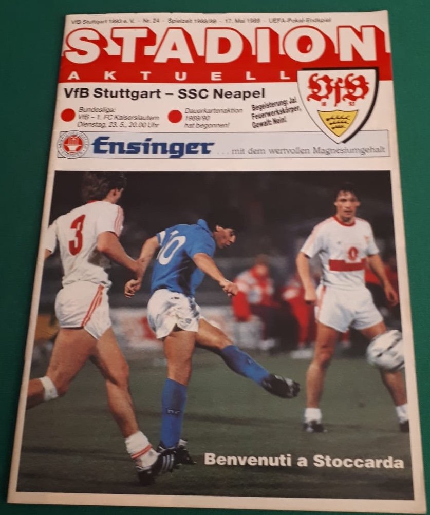 Nel 1989, a differenza di oggi, anche la finale si gioca sulla base del doppio confronto. La partita di andata si disputa e Napoli, e come si può facilmente immaginare lo stadio straborda di tifo, quasi 80.000 persone che sognano il primo trofeo europeo.