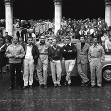 Foto di gruppo di giornalisti sportivi Rai al Giro d’Italia 1967. Sandro Ciotti è al centro. Gli altri sono Adone Carapezzi, Enrico Ameri, Nando Martellini, Sergio Zavoli, Adriano De Zan e il capo spedizione Nino Greco. (Fonte Wikipedia)