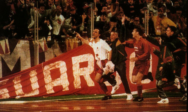 Mazzone schiera contemporaneamente Moriero, Totti, Giannini, Fonseca e Balbo. Giusto per essere in linea con lo striscione sotto il tabellone. E la Roma attacca, per la verità più con ardore e grinta che con la testa. Ciò non basta e il primo tempo va in archivio pur registrando una netta supremazia giallorossa. Per far alzar le braccia al cielo ai tifosi giallorossi bisogna attendere il secondo tempo, esattamente il 15’. Moriero, che raccoglie l’ennesima “pallaccia” maldestramente rinviata da parte di una difesa avversaria in affanno, insacca con una gran botta da fuori dando linfa vitale a una speranza che si stava indebolendo. L’urlo squarcia la notte di Roma. L’Olimpico è bollente, la Roma può ancora farcela, mancano trenta minuti. La Roma attacca con tutto quello che ha dentro. All’83’ punizione. Sul pallone va Aldair, e Giannini si sistema al centro dell’area. Pluto lascia poi la palla a Carboni, e il Principe racconterà più tardi che “a quel punto mi sono spostato, perché sapevo che con il sinistro Carboni avrebbe chiuso il cross, che l’avrebbe tirato corto e forse anche un po’ sporco”. Palla in mezzo e Giannini insacca di testa. Epico a questo punto il commento di Cerqueti in diretta Rai: “Proprio lui, Giannini, Giannini, il due a zero per la Roma, il delirio sotto la Curva Sud, si è tolto la maglia Giannini. E poi c’è chi non crede alle favole, è un Principe che ha preso sottobraccio la sua Roma, non ha sbagliato praticamente un pallone”.