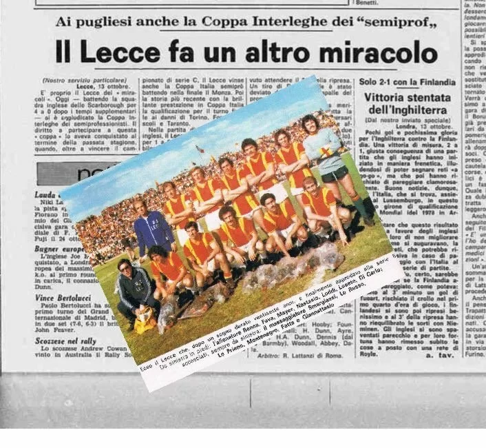 Il secondo titolo, la Coppa Italo-Inglese Semiprofessionisti (Anglo-Italian Semiprofessional Tournament) è una competizione calcistica organizzata tra squadre semiprofessionistiche, congiuntamente, dalle federazioni inglese ed italiana, come complemento al torneo Anglo-Italiano. Questa coppa, istituita nel 1975, vede di fronte i vincitori della Coppa Italia Semiprofessionisti (oggi coppa Italia di C) e quelli della Football Conference inglese (oggi National League), prima categoria non completamente professionistica. La squadra salentina, vincitrice della Coppa Italia semi-professionistica 1975-76 affronta lo Scarborough, formazione del North Yorkshire e campione del Football Association Challenge Trophy, la neo istituita Coppa d’Inghilterra per semiprofessionisti; all’andata, a Scarborough, il 24 settembre 1976, la squadra di casa vince 1-0 con un goal di Harry Dunn. Al ritorno, due settimane più tardi, il Lecce ribalta tutto. Prima, impiega tre quarti dell’incontro per pareggiare i conti con l’andata (autogoal di Deere al minuto ‘66). Si rimane, quindi, in parità fino alla fine dei tempi regolamentari, e i giallorossi trovano la vittoria finale soltanto nel corso dei tempi supplementari, durante i quali il centravanti Gaetano Montenegro si scatena, e mette a segno ben tre goal, ai minuti 101′, 113′ e 115’, assicurando così la vittoria per 4-0, e la vittoria del trofeo agli uomini di Mimmo Renna. La competizione ha però vita breve e si disputa soltanto in due edizioni (1975 e 1976) perché viene soppressa proprio nel ’76, facendo si che il Lecce rimanga, nella storia, l’unica squadra italiana ad averla vinta (l’anno precedente è il Brescia a cercare, senza successo, la vittoria che va, invece, alla formazione del Wycombe).