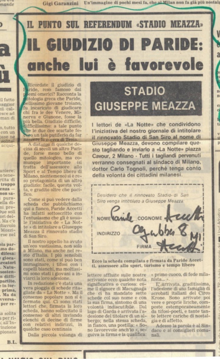 Poi il colpo di genio… uno di questi tagliandini fu fatto firmare a Paride Accetti che all’epoca ricopriva l’incarico di “Assessore allo Sport e al Tempo Libero”. La scheda così firmata venne pubblicata sul quotidiano accompagnata da un titolo forte, dal forte riferimento ai poemi omerici, a supporto dell’iniziativa: “IL GIUDIZIO DI PARIDE, anche lui è favorevole”. Il quotidiano cavalca in maniera importante la questione e l’amministrazione pubblica, con il Sindaco in primis, si rende conto che sarebbe ormai impopolare non farlo.