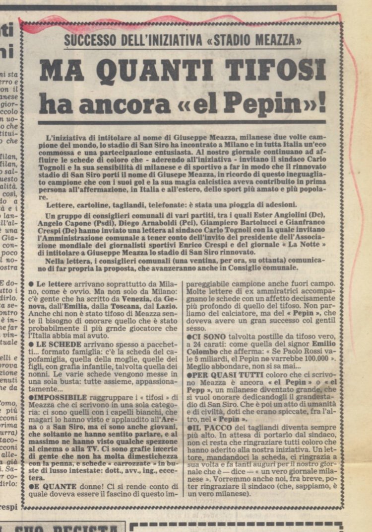 Natucci insieme al responsabile dei Servizi Sportivi de “La Notte” Enrico Crespi, promuove l’iniziativa di intitolazione di San Siro al grande campione, pubblicando sulle pagine del quotidiano una scheda che i lettori avrebbero dovuto riempire dichiarandosi quindi favorevoli all’iniziativa. Ne arrivarono migliaia, più di quanto i fautori stessi si sarebbero mai immaginato. Ovviamente furono fatte vedere al sindaco dell’epoca Carlo Tognoli, ma la situazione era in stallo.