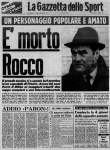 GLIEROIDELCALCIO.COM – Il 20 febbraio 1979 il calcio italiano perdeva un grande personaggio, Nereo Rocco. Essendo stato un grandissimo ammiratore, oggi lo voglio ricordare ancora dopo ben 42 anni. Ricordo che il giorno della sua scomparsa raccolsi tutti gli articoli dei quotidiani d’Italia dove venivano riportate tantissime testimonianze di personaggi del mondo dello sport. Dopo averli ritagliati li incollai su un grande quadernone che poi inviai alla famiglia Rocco. A distanza di qualche anno (come si legge nel libro) gli occhi di Bruno si posarono sul mio quadernone che gli servì tanto per la pubblicazione del volume “Padre Paron”, uscito a febbraio del 1984, e che oggi custodisco gelosamente con dedica e le firme dei figli (Bruno e Tito) e della signora Maria. Conservo anche il Guerin Sportivo numero 8 del 1984: quando chiesi di ricordare questo grande allenatore (al suo 15°anniversario), venni accontentato, nelle pagine di “Amarcord” da una grande firma del calcio che porta il nome di Adalberto Bortolotti.