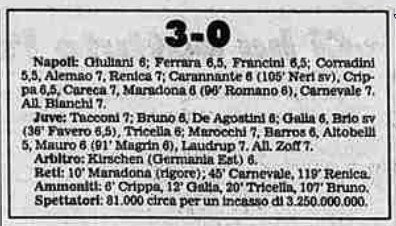 Nella doppia finale contro lo Stoccarda il Napoli riesce ad aver ragione dei tedeschi dopo essere passato in svantaggio al 17°, un (discusso) rigore di Maradona e ad un rocambolesco e caparbio gol di Careca ribaltano il risultato, con il San Paolo che esplode e si riempie di fumogeni anche nelle tribune.