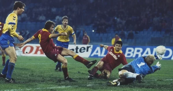 Mancano solo 30’ minuti dal sogno della terza finale europea per la compagine giallorossa. Saltano allora le tattiche, gli schemi e le marcature. Ora solo un cuore gettato oltre l’ostacolo può permettere di sognare. Entra Muzzi al posto di Comi e la Roma è ora a sola trazione anteriore. Ora attacca a testa bassa. Purtroppo alcuni errori in fase di conclusione e una serata ovviamente di grazia del portiere avversario non consentono ai giallorossi di concretizzare in maniera alcuna. All’87 finalmente accade ciò che è giusto. Azione manovrata della Roma nonostante il pressing degli avversari e Pellegrini mette palla al centro. Berthold colpisce di testa ma la difesa danese respinge al limite dell’area. A questo punto Desideri lascia partire una gran botta che il portiere Schmeichel respinge corto. Qui il tempo si ferma. La palla rimbalza lentamente al centro dell’area. Cala il silenzio. Sono solo frazioni di secondi eppure sembrano un’eternità. Sulla palla arrivano Rizzitelli e Voeller. La palla schizza in porta. È boato! È l’apoteosi! Chi ha tirato? Chi ha segnato? Probabilmente è stata spinta da tutti coloro che erano sugli spalti. Poco importa scoprire poi che è stato Voeller. Del resto Voeller è uno di noi. Ciò che importa è che la palla sia entrata.