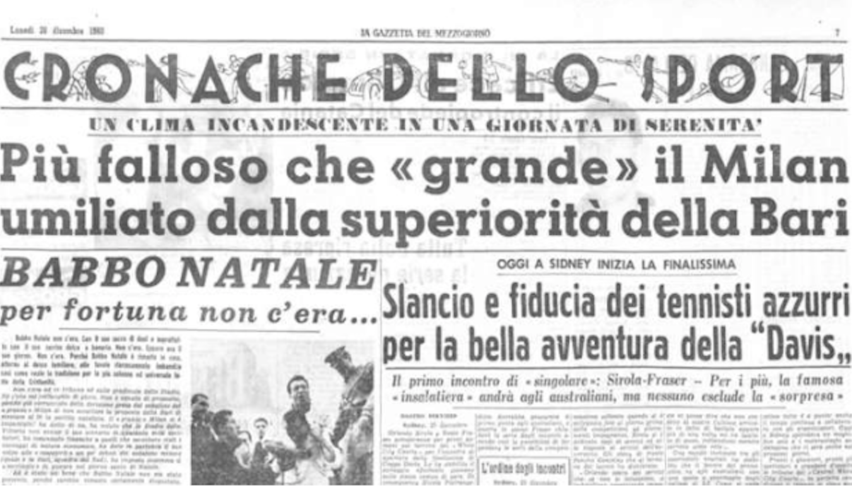 […] Fra il 26 e il 27 dicembre, i giornali ci vanno giù pesante. Secondo quanto riportato dalle cronache dell’epoca,“affollando le infermerie degli avversari di turno e usufruendo di arbitraggi molto generosi, il Milan può certamente arrivare allo Scudetto, sia pure suscitando l’indignazione popolare com’è accaduto domenica. Un Bari che volesse trarre una giusta morale da questa partita dovrebbe, a cominciare dalla prossima settimana, mettere in campo undici uomini pronti a menare prima cazzotti e poi pedate al pallone”.