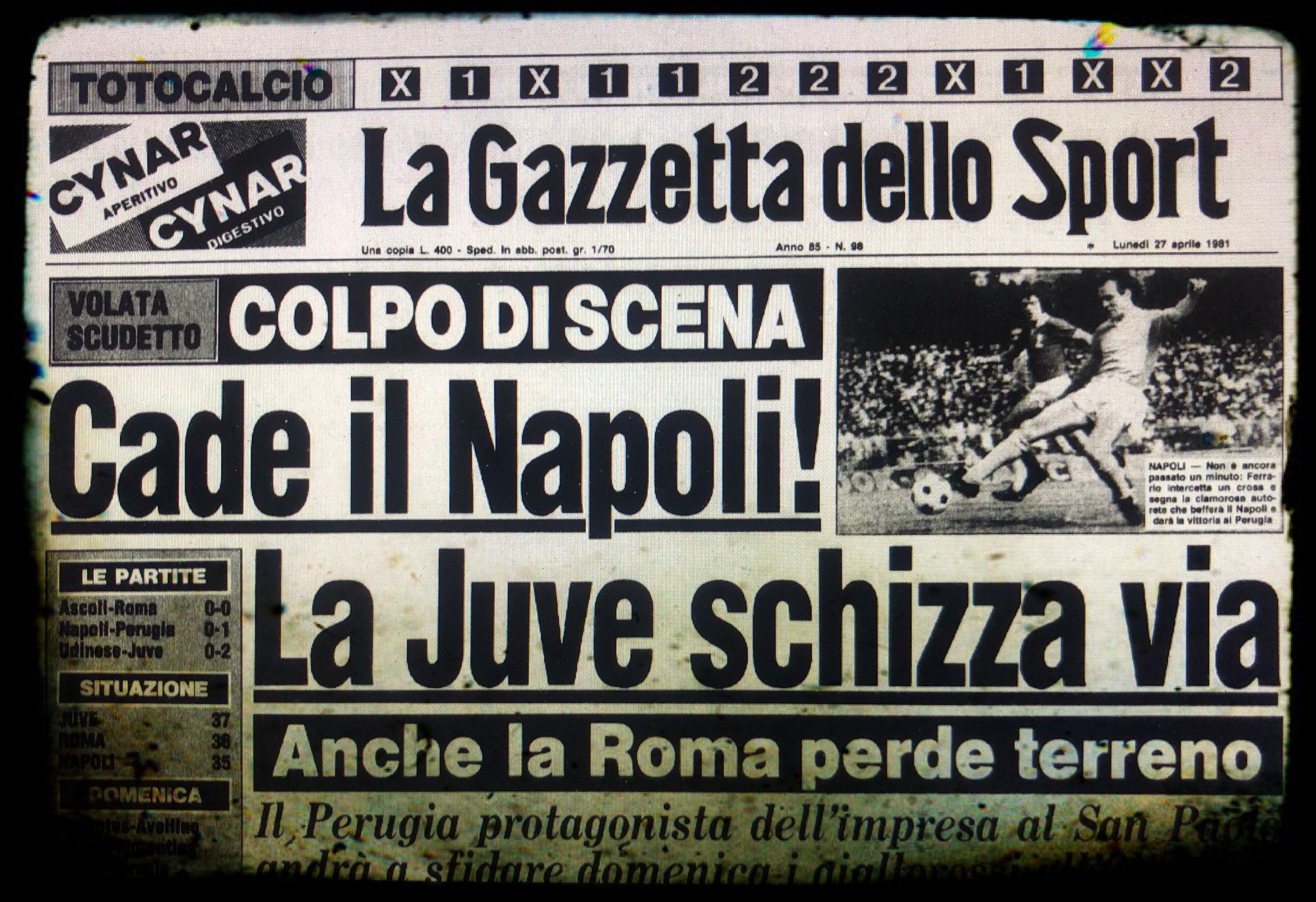Quel pomeriggio le statistiche passarono in secondo piano… Clamoroso al San Paolo: il Perugia ultimo della classe espugnò Fuorigrotta, grazie all’autorete di Moreno Ferrario nelle battute iniziali. La Vecchia Signora sfruttò il pareggio dei giallorossi sul campo dell’Ascoli e grazie al blitz di Udine rimase da sola al primo posto. Mancavano due settimane alla sfida in riva al Po contro i capitolini…