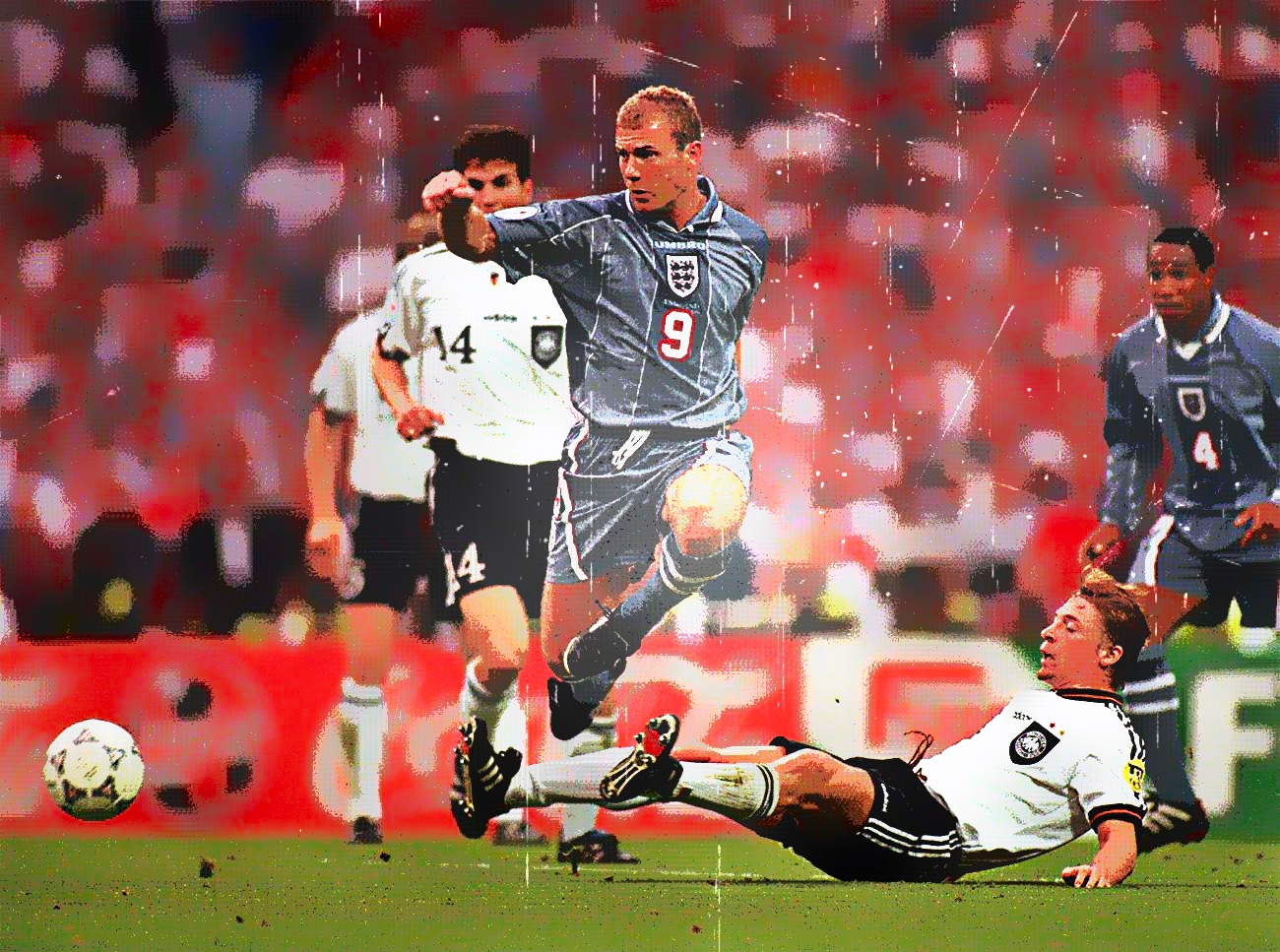Mai fidarsi dei tedeschi quando si parla di calcio; chiedere alla Francia di Platini, raggiunta sul 3-3 in una semifinale spagnola che sembrava già scritta. E infatti, nonostante l’arrembaggio precauzionale dei calciatori guidati da Venables e il momentaneo vantaggio del cecchino Shearer, ci penserà una incursione furtiva di Stefan Kuntz a riportare il risultato in parità. I fantasmi di Italia ’90 inizieranno a manifestarsi, almeno in maniera sottile, dapprima dopo il tiro respinto di Sheringham sulla linea e poi con il sontuoso stacco del numero 9 del Blackburn, finito fuori di un nulla.