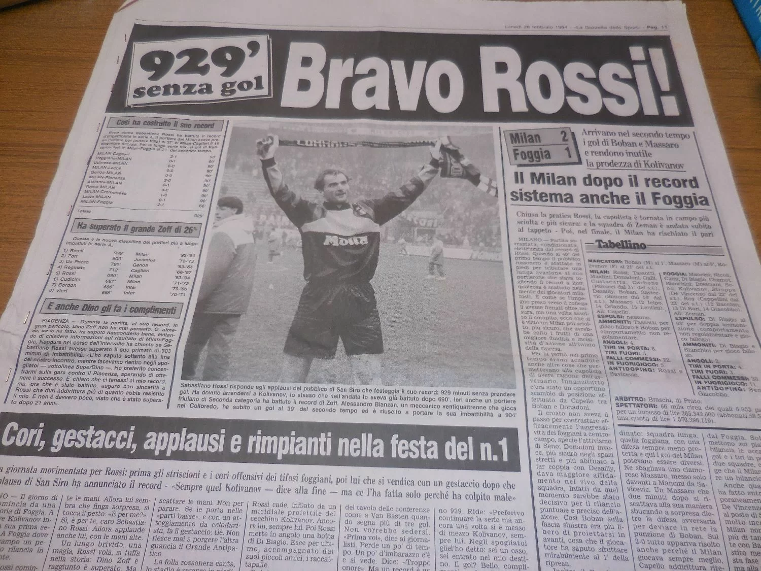 GLIEROIDELCALCIO.COM – 27 febbraio 1994, Stadio San Siro – Meazza, Milan-Foggia… “Siamo al quarantunesimo minuto del primo tempo e Costacurta si ferma in mezzo al campo per applaudire in direzione di Sebastiano Rossi, lo stadio si alza in piedi e tributa un’ovazione al lungo portiere rossonero. Il primato di imbattibilità di Dino Zoff, 903 minuti senza gol, è raggiunto e superato” (Cit. l’Unità, 28 febbraio 1994).