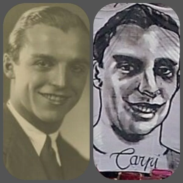 Passione e onestà sono i segni distintivi per Giorgio Carpi. La voce di Andrea, complice forse la sua esperienza musicale, è sempre più gradevole e la conversazione prosegue da sola… “Per papà la Roma era tutto. Prima giocava con il Roman confluito poi nella Roma, nella squadra voluta anche dal padre che aveva lavorato sodo al progetto e lui ne diventa un giocatore. Il padre che muore qualche mese prima della fondazione della società e la madre, già separata dal padre, era andata a vivere in Brasile. Ha solo diciotto anni… e la Roma diventa per lui un riferimento fortissimo, è la sua famiglia. Aveva infatti sempre a cuore le vicende dei suoi compagni e si è sempre prodigato anche per il futuro di ognuno di loro. È noto di come abbia spronato Ferraris ad aprire il bar. Meno nota, forse, la costituzione di una cooperativa con alcuni calciatori per permettere a tutti di comprarsi una casa a condizioni agevolate. I suoi compagni erano sempre al centro dei suoi pensieri”. L’11 gennaio 2015 la Sud crea una delle coreografie più significative: 16 “pezze” raffiguranti altrettanti calciatori che hanno fatto e stanno facendo la storia della Roma e sotto la scritta “Figli di Roma, capitani e bandiere…questo è il mio vanto che non potrai mai avere!”. Tra i sedici anche Giorgio Carpi… ”Si, c’eravamo appena seduti con la famiglia per vedere la partita, non ci avevamo fatto caso, è stato mio nipote che se ne è accorto. Emozione e felicità, papà sarebbe stato orgoglioso. Proprio vicino a Totti poi”… infatti segnerà una doppietta in quella partita.