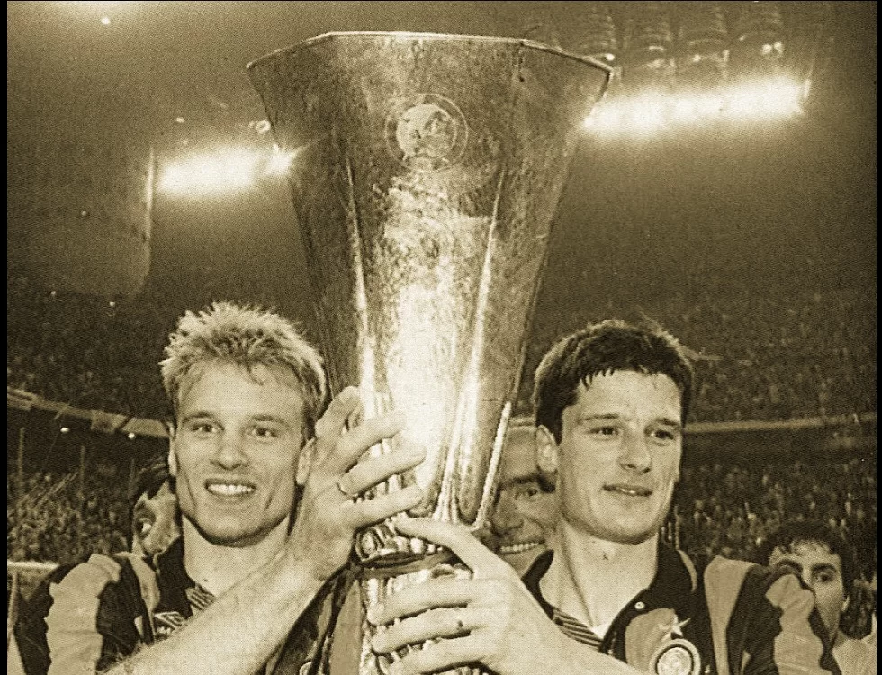 GLIEROIDELCALCIO.COM (Antonio Capotosto) – Domenica 28 maggio 1995, un giorno che per l’Inter non significa solo l’ultima rete di Alessandro Bianchi. Quel pomeriggio Dennis Bergkamp e Wim Jonk scrissero l’explicit in maglia nerazzurra. Era la seconda annata ad Appiano Gentile per i due olandesi, arrivati nell’estate ’93 in una campagna acquisti costata circa 60 miliardi. Nella stagione antecedente il Mondiale statunitense anche la Beneamata era pronta a contendere il titolo al Milan: Osvaldo Bagnoli, refrattario all’abbondanza, si cautelava preferendo l’usato sicuro in difesa, proteggendo con un gruppo di gregari (Berti subì un grave infortunio, senza dimenticare i guai muscolari di Bianchi) le spalle di Dennis – sottratto alla Juventus – sguinzagliato in attacco con Sosa. Ma il campionato del Biscione fu assai deludente, e addirittura l’Inter rischiò una clamorosa retrocessione, con il tecnico della Bovisa sostituito da Marini. Tutt’altra musica in Europa, dove Bergkamp e Jonk furono decisivi per la conquista della Coppa Uefa: Dennis fu il capocannoniere della competizione (8 centri) e Wim realizzò cinque reti (l’ultima nella finale di ritorno). Nella stagione 1994-’95 l’Inter ottenne a fatica la qualificazione in Europa e venticinque anni fa i due olandesi indossarono per l’ultima volta la casacca nerazzurra. Brutti di giorno e belli di notte.