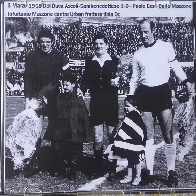 GLIEROIDELCALCIO.COM (Federico Baranello) – Il Derby, ovunque si giochi, non è mai una partita qualunque. Questa regola è valevole nei cinque continenti e nulla muta se il palcoscenico è uno stadio da 100.000 posti o un campo di periferia. Anzi, spesso, è proprio nelle categorie meno titolate che la rivalità è più accesa. Non cambia l’ansia, l’aspettativa, la paura. Spesso l’attesa consuma e sfinisce i protagonisti, ma anche i tifosi intenti a preparare le coreografie più importanti. E nulla cambia se si tratta di Derby regionali, provinciali o stracittadine. In gioco c’è sempre un predominio che si vuole avere a tutti i costi. Il Derby che volevamo raccontare non è uno di quelli dal nome blasonato e protagonista delle Pay-Tv come “El Clasico” spagnolo o il “Superclasico” argentino. Non è nemmeno l’“Old Firm” scozzese o il “North-West Derby” inglese. È un Derby nostrano, è il Derby del Tronto (o Piceno). Si tratta di una partita dal grande fascino che contrappone l’Ascoli alla Sambenedettese, dove la cultura dell’entroterra si scontra con la cultura del mare, il capoluogo contro chi rivendica una propria autonomia. Una sfida che manca ormai da troppi anni; risale infatti al 1986, in Coppa Italia, l’ultimo incontro… oltre trent’anni fa. In particolare vogliamo raccontare e mostrare delle immagini in esclusiva mai viste prima relative all’incontro tra il Del Duca Ascoli e la Sambenedettese, terminato 1-0 con rete di Gasparini al 39’, di domenica 3 marzo 1968, esattamente cinquanta anni fa. Un Derby in cui il Capitano dei bianconeri Carlo Mazzone s’infortuna gravemente. Un infortunio che per lui significa di fatto la fine della carriera. Tenta di rientrare in campo nella stagione successiva ma è costretto ad abbandonare definitivamente il calcio giocato già nelle prime giornate.