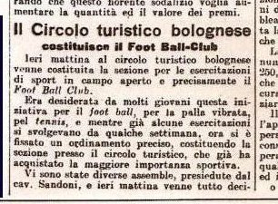 GLIEROIDELCALCIO.COM – “Ieri mattina al circolo turistico bolognese venne costituita la sezione per le esercitazioni di sport in campo aperto e precisamente il Foot Ball Club” (Cit. Il Resto del Carlino, 4 ottobre 1909).