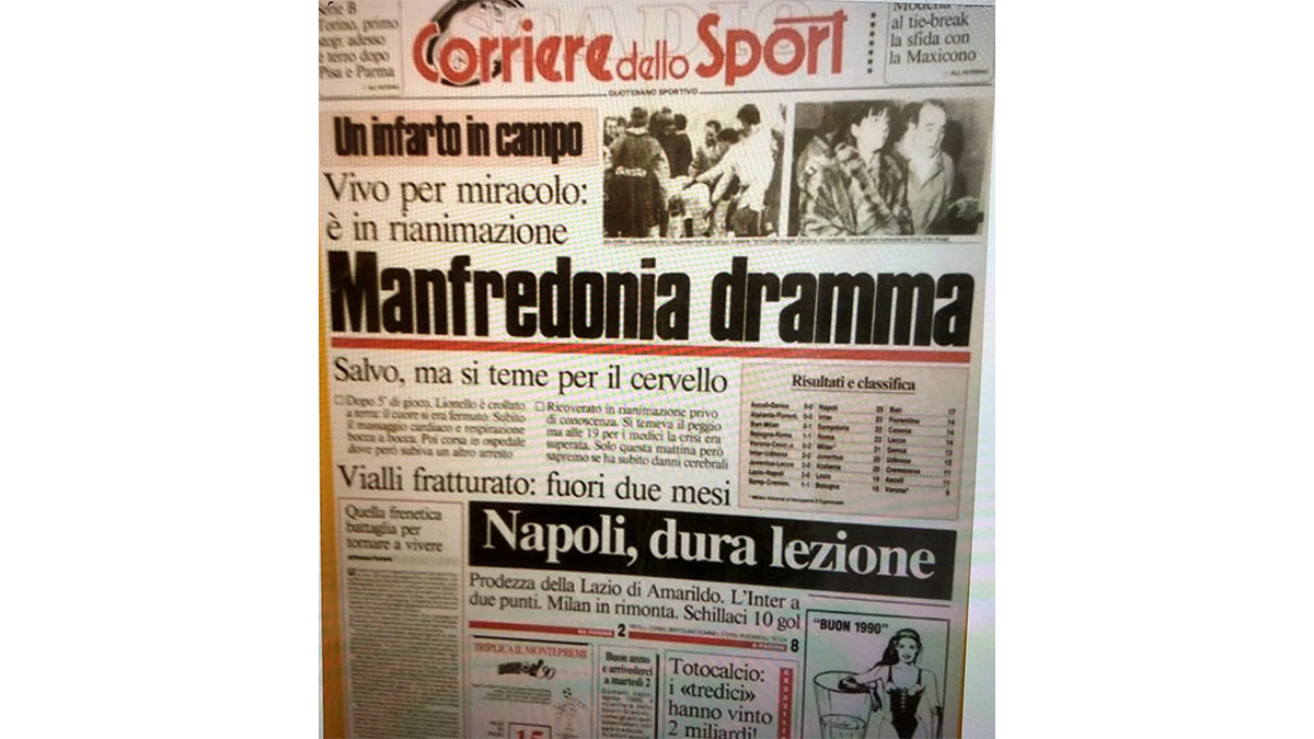 Il 30 dicembre del 1989, nella partita tra Roma e Bologna, il centrocampista giallorosso Lionello Manfredonia venne colpito da un malore e cadde sul prato dell’Olimpico. Venne subito soccorso dal suo ex compagno di squadra Giordano Bruno e poi dai medici. Il calciatore venne salvato ma non tornerà più a giocare.