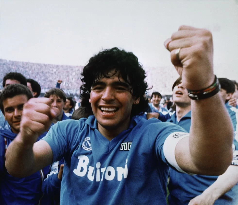 Argentine soccer superstar Diego Armando Maradona cheers after the Napoli team clinches its first Italian major league title in Naples on May 10, 1987. (AP Photo/Meazza Sambucetti)