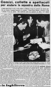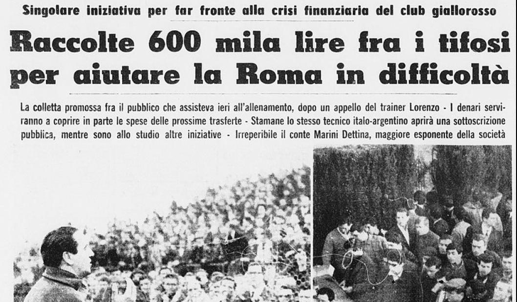 Il 30 Dicembre la Roma si allena al Tre Fontane, in vista della difficile trasferta di Vicenza e Lorenzo, al termine dell’allenamento stesso, si avvicina alla rete dove sono assiepati i tanti tifosi e nel discorso annuncia che la situazione è talmente grave che le casse vuote non permetteranno di andare in trasferta. Il cuore dei tifosi raccoglie subito una piccola somma, ma si organizza qualcosa di più “serio” per l’indomani mattina. L’appuntamento è al Teatro Sistina, messo a disposizione da Garinei. Lo stesso Giacomo Losi “Er Core de Roma”, il capitano della Coppa delle Fiere del ’61, si ritrova suo malgrado a girare tra i tifosi a raccogliere le offerte. Alla fine si raccolsero circa 700.000 mila lire. Il presidente Dettina, ignaro della colletta rifiutò la somma, ma le polemiche dei suoi oppositori divamparono.