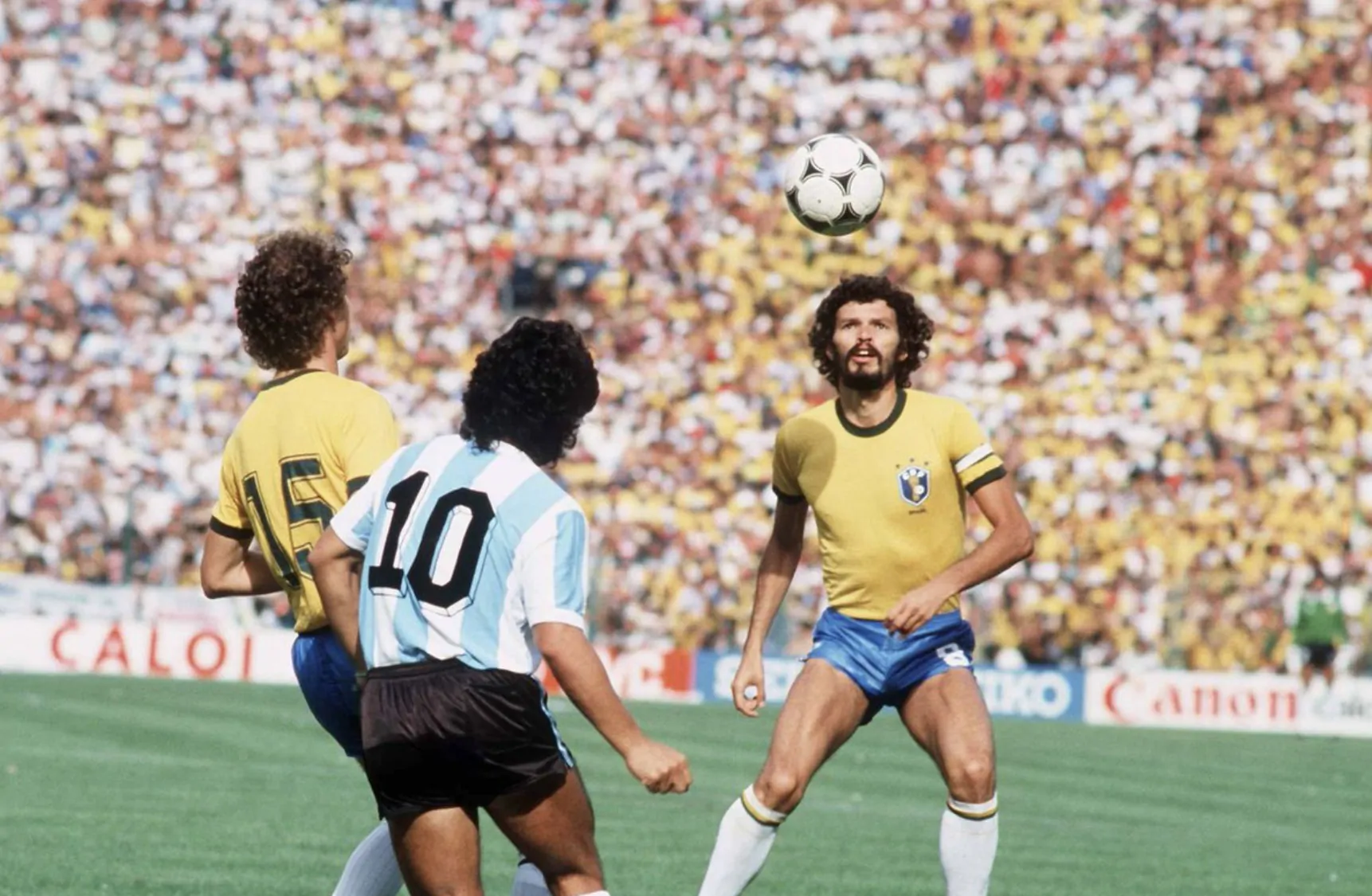 Il Brasile poteva tessere il proprio abituale gioco ancor più liberamente. Gli argentini iniziavano attaccando (nel primo tempo avrebbero registrato un possesso di palla in termini statistici in percentuale maggiore rispetto agli avversari) e nei primi minuti avrebbero creato molteplici occasioni, tutte rintuzzate. Ma l’Argentina aveva anche un limite: le proprie azioni erano prevalentemente basate sulle invenzioni individuali; la manovra corale ragionata scarseggiava; solo Ardiles cercava di dare ordine, coerenza e geometrie. Abbondavano, invece, le iniziative personali, soprattutto di Maradona, che fatalmente finivano annullate dalla difesa brasiliana. E se l’Argentina cercava da subito di condurre assalti, era il Brasile al 12’ a passare: dopo un’azione argentina, Galván perdeva palla e il Brasile ripartiva. Fallo di Passarella su Serginho. Punizione bomba di Eder a 174 km orari, traversa; Zico riprendeva e la metteva dentro. Al 29’ Maradona si segnalava per un doppio dribbling e dava a Calderón, che sparava alto.