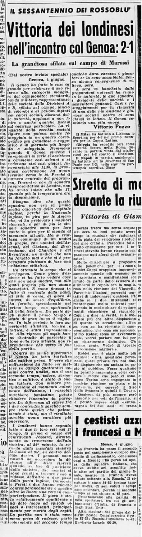 Comunque, la tradizione delle partite tra Genoa e squadre inglesi ha radici lontane, e risale agli inizi del secolo scorso. Nel 1912 il Genoa giocò una partita contro i Wanderers che, come la formazione londinese del 1953, non era una squadra di club ma una selezione di giocatori britannici. L’anno dopo ci fu una partita tra il Genoa ed il Reading. Poi, nel 1922, si registra un Genoa-Liverpool, giocato a Marassi, il 4 giugno (altra ricorrenza che cade in questa giornata) davanti a 15.000 spettatori e vinto dagli inglesi per quattro a uno. Quella partita ebbe un’ideale rivincita circa 70 anni dopo, quando il Genoa vinse per due reti a uno contro il Liverpool al Ferraris, il 18 marzo del 1992.