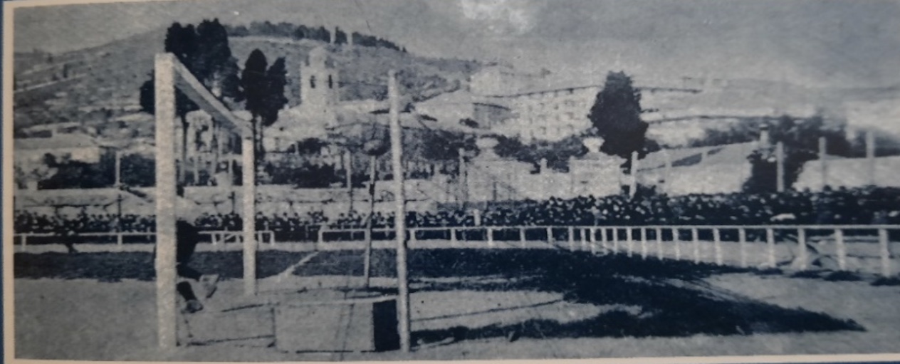 Lo stadio. Esaurite la tribuna centrale e le gradinate, lo stadio è cinto interamente da un gran pavese, sì che il campo di Marassi pare una nave pronta per il varo. La gente si pigia numerosa sui balconi e si spinge dalle finestre ʺÈ la festa di noialtri˝, sembrano volere gridare.