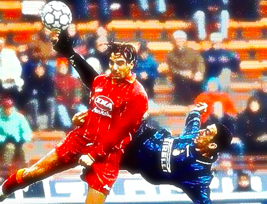 Dopo l’iniziale gol di Ganz, al minuto ’39 della prima parte di gara succede qualcosa che rimarrà negli annali di questo sport. Uno dei gol più belli mai visti su di un campo di calcio, una rovesciata effettuata con coordinazione incredibilmente precisa, dopo una svirgolata a spazzare di un difensore romanista. Djorkaeff vide alzarsi in campanile un pallone perfetto. Volo in area a sovrastare Petruzzi (incolpevole protagonista suo malgrado) e destro al volo a scendere verso il palo più lontano.
