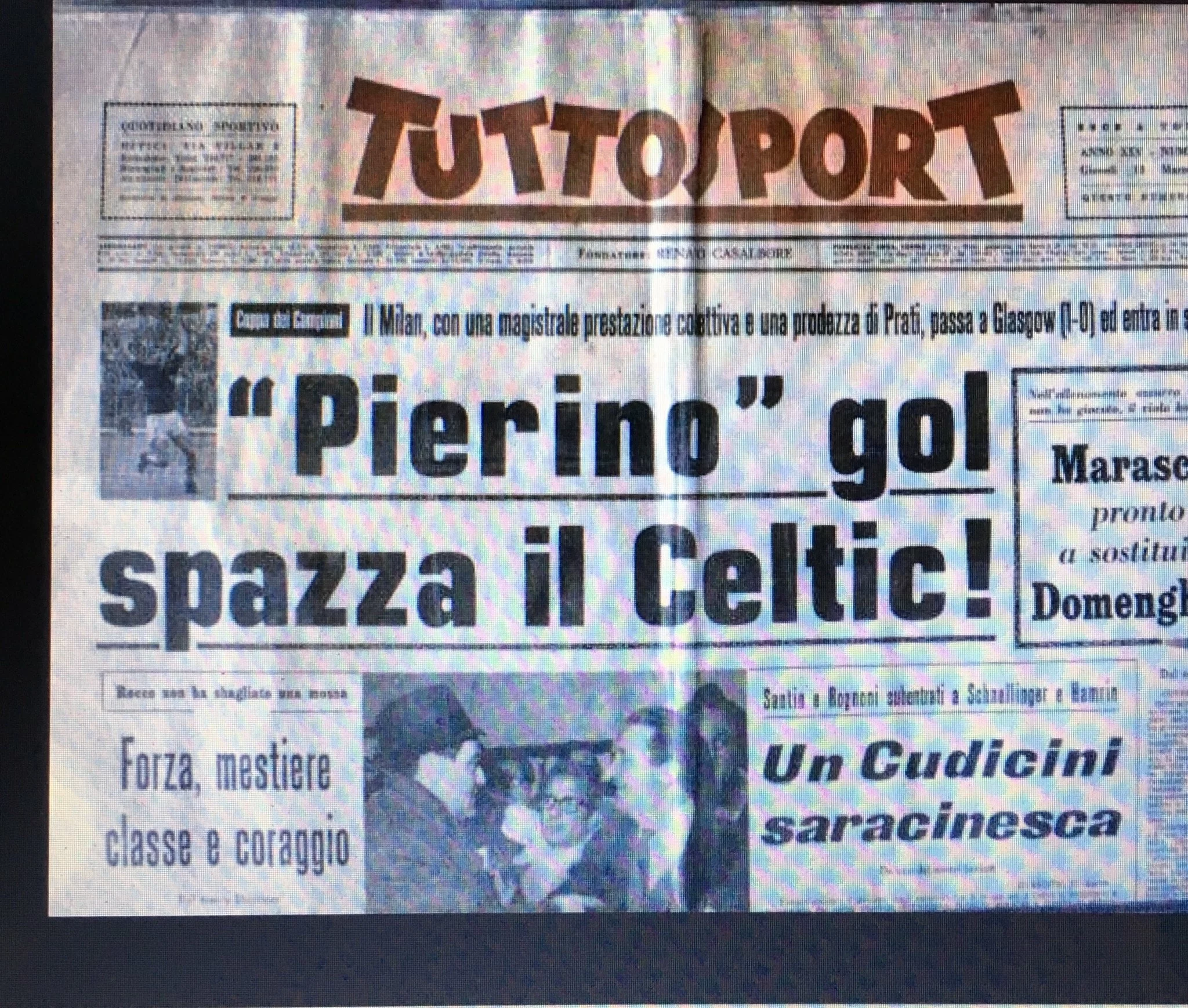 12 marzo 1969, esattamente 50 anni fa, il Milan scende in campo al Celtic Park di Glasgow con tutti gli sfavori del pronostico. Il Celtic in casa è una macchina di vittorie e di gol e basa tutto su una furia atletica che travolge gli avversari. Rocco sa che dovrà subire tanto e schiera una squadra più difensiva del solito. Gioca con una sorta di 5-4-1 con Malatrasi libero accanto a Rosato, Maldera a sinistra e Scala invece di una seconda punta in avanti.