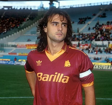 […] Giuseppe Giannini – bandiera, condottiero e capitano – è stato l’assoluto protagonista della squadra giallorossa tra gli anni ’80 e ’90. […] Una Roma meno vincente di quella che l’ha preceduta e di quella che è venuta dopo, ma che è rimasta nel cuore dei tifosi. […] Cresciuto a Frattocchie esordì in prima squadra nella stagione 1981-1982. […] Il Barone Niels Lieldhom stravedeva per lui, ma è con Eriksson che inizia a vedere stabilmente il campo. Nel 1986 è tra i protagonisti della rimonta sulla Juve sfumata nella maledetta partita con il Lecce. Nella seconda parte degli anni ’80 guida una Roma che fatica a stare ai vertici. […] Non vincerà lo scudetto, ma alzerà due Coppa Italia (1986 e 1991) e sfiorerà la Coppa Uefa nella doppia finale con l’Inter sempre nel 1991. […] Fu protagonista in azzurro agli Europei del 1988 e a Italia 90 (dove segno un gol contro gli Stati Uniti). […] Con la Roma, come accaduto per molti eroi degli anni ’80, si lasciò male. Nelle ultime stagioni ci furono diverse incomprensioni con la società e la goccia che fece traboccare il vaso furono le dure parole del presidente Sensi dopo un rigore sbagliato in un derby. Giannini salutò nell’estate del 1996. “Fallì piagne Peppe”, gridarono i tifosi fuori Trigoria mentre il principe lasciava in silenzio la sua casa.