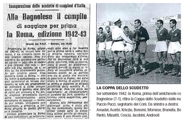 LAROMA24.IT (Federico Baranello) – L’estate del 1942 è attraversata in lungo e in largo da forti venti di guerra: è l’estate della battaglia delle Midway, della prima battaglia di El Alamein e si combatte nell’Atlantico e nel Pacifico. Rappresaglie e deportazioni sono all’ordine del giorno in Europa e anche il Brasile dichiara guerra all’ “Asse italo-tedesco”. Nonostante ciò, complice la propaganda del regime mista alla voglia di normalità da parte della popolazione, il calcio e la relativa campagna acquisti e cessioni da parte delle società non si ferma. E non si ferma la Roma, neo Campione d’Italia, che proprio per difendere sul campo il titolo si rafforza con l’innesto di sette elementi: il portiere Blason dal Napoli, i mediani Salvioli e Benedetti II rispettivamente dal Perugia e dall’Amatori Bologna, oltre a quattro attaccanti come Conti e Dagianti dal Padova, Santunione da una squadra minore di Modena e Cattaneo dalla Novese. Con questi innesti la dirigenza della compagine giallorossa ritiene di avere una squadra in grado di difendere il titolo. La stagione nasce con questi presupposti e la prima gara in amichevole è contro l’Ilva Bagnolese, una squadra la cui storia è legata alla nascita e sviluppo del centro siderurgico dell’omonima azienda a Bagnoli, il 6 settembre 1942. Potrebbe essere un’amichevole di poco conto, la classica “sgambata” che serve a trovare la forma giusta per l’inizio stagione e da consegnare poi all’oblio. Invece questo incontro ha qualcosa che lo rende particolare. Non certo il risultato di 7-1 ottenuto con due doppiette (Amadei e Rossi) oltre alle reti di Cappellini, Kriezu e Dagianti.