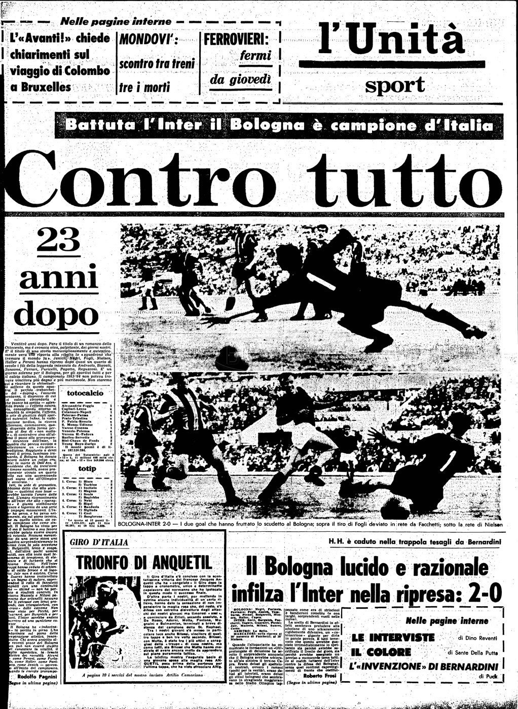 Arriva il 7 di giugno e, mentre Helenio Herrera decide per la continuità, schierando l’undici laureatosi giorni prima campione d’Europa, Fuffo Bernardini tenta una mossa a sorpresa, quella di schierare al posto di Pascutti, il terzino Capra, con l’obiettivo di rafforzare la difesa, di fronte agli attacchi dei fortissimi avanti interisti. La partita, che si gioca in uno stadio infuocato ed in un clima torrido, è equilibrata nel primo tempo, mentre volge a favore del Bologna nella seconda parte, quando l’eroe che non ti aspetti, Fogli, oltre che a francobollare con successo il fuoriclasse nero azzurro Suarez, mette dentro una punizione dal limite dell’aria, quando manca ormai solo un quarto d’ora al termine. Ci pensa poi Nielsen al minuto ’83 a raddoppiare e a chiudere i giochi: Il Bologna è campione d’Italia 1963/64 a distanza di 23 anni dall’ultimo titolo raggiunto.