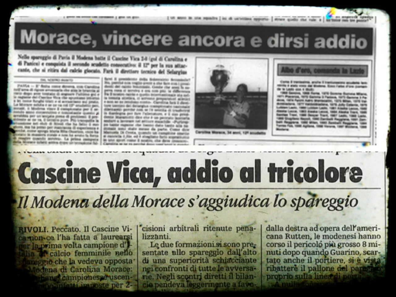 GLIEROIDELCALCIO.COM (Giovanni Di Salvo) – Il primo spareggio per l’assegnazione dello scudetto, nella storia del calcio femminile targato FIGC, si è disputato il 7 giugno 1998 allo stadio “Pietro Fortunati” di Pavia. Infatti nella stagione 1997/98 Modena e Cascine Vica, dopo una corsa durata trenta giornate, avevano chiuso appaiate in vetta alla classifica con 79 punti, frutto di 25 vittorie, 4 pareggi ed una sola sconfitta. Lo snodo fondamentale nella corsa al tricolore era stato alla tredicesima giornata di ritorno, il 9 maggio, quando le campionesse in carica del Modena avevano perso in casa per 3-2 col Milan e il Cascine Vica, espugnando per 2-0 il campo del Segrate, ne aveva approfittato per agganciare le emiliane in testa. La situazione non era più cambiata nei restanti due turni di campionato perché entrambe le contendenti avevano fatto bottino pieno. Pertanto, per assegnare il titolo di Campione d’Italia, serve uno spareggio. Alla fine ad aggiudicarsi lo scudetto sono le gialloblù allenate da Maurizio Berselli, che si impongono sulle piemontesi per 2-0. Le reti sono siglate al 12′ del primo tempo da Carolina Morace, con un perfetto colpo di testa sul traversone dalla destra dell’americana Rutten, e al 13′ della ripresa da Patrizia Panico, con un preciso pallonetto che rende vana l’uscita del portiere Di Bernardo. Questa fu l’ultima partita dell’attaccante veneziana, che dopo una straordinaria carriera costellata di vittorie, decise di appendere gli scarpini al chiodo. Nella sua ultima stagione da calciatrice Carolina Morace vinse la classifica marcatrici con 41 centri.