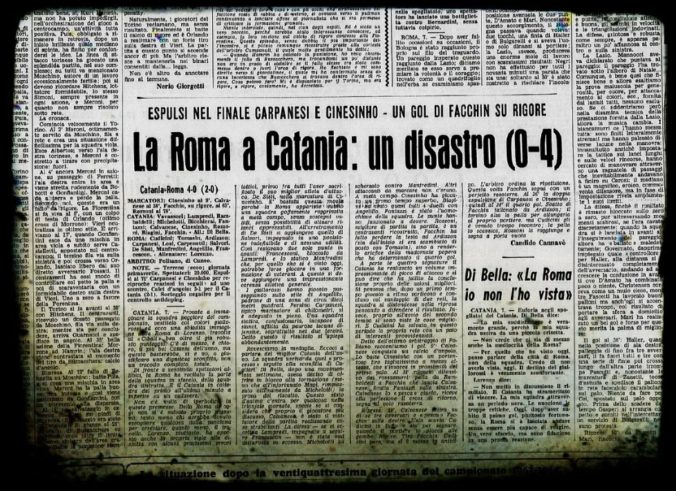 “Provate a immaginare la squadra peggiore del campionato, vestitela coi colori giallorossi ed ecco una sbiadita immagine della Roma di Lorenzo, travolta al «Cibali» ben oltre il già robusto punteggio. C’è di mezzo, è chiaro, il più bel Catania dell’anno, ma questo basterebbe, si e no, a giustificare una dignitosa sconfitta, non un tracollo completo, totale. Di fronte a ventimila spettatori allibiti, la Roma ha recitato la parte della squadra in sfacelo, della squadra distrutta. E il Catania in cattedra dal primo all’ultimo minuto a infierire su un cadavere” (Cit. La Gazzetta dello Sport, 8 marzo 1965).
