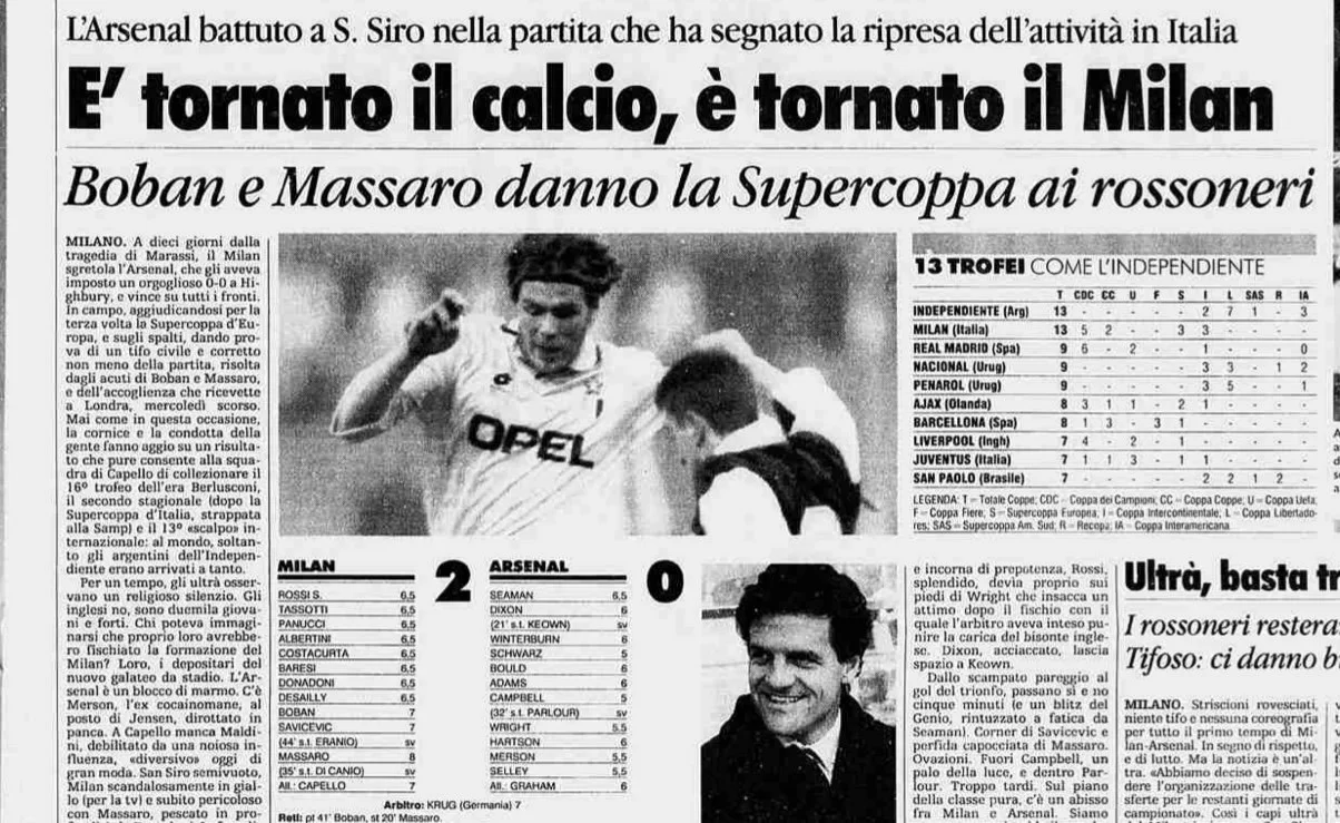 Boban ci provò un paio di volte. Prima su una punizione, calciata troppo centralmente e poi, convergendo dalla destra, con un tiro di sinistro che sfiorò il secondo palo di circa un metro. Poi, nel giro di pochi minuti, si passò dall’occasione mancata da Wright, bravissimo a controllare in area e calciare un pallone pennellato da Winterburn, trovando la risposta poco plateale di Rossi, al gol del vantaggio rossonero, con una splendida ripartenza in verticale e concretizzata in tre passaggi. Da Rossi a Donadoni che servì Massaro, splendido filtrante per l’inserimento di Boban che in percussione centrale, dopo trenta metri di corsa fra le maglie rosse della difesa inglese, infilò con la punta del piede David Seaman in uscita, firmando così al 41° minuto di gioco il vantaggio milanista. Boban e Savicevic prima del riposo regalarono ancora un saggio del loro talento con uno splendido dialogo di prima al limite dell’area londinese. Con l’inizio della seconda frazione di gioco, mentre gli striscioni dei vari Milan Club, vennero srotolati e affissi, a colorare il “Meazza” di rossonero e con essi tornarono a farsi udire i cori da stadio, il Milan tentò di abbassare il ritmo nel tentativo di addormentare la partita, portando pericolosamente l’Arsenal nella propria trequarti di campo. Al 60° minuto di gioco, sugli sviluppi di un calcio d’angolo, Wright depositò in rete, ma l’arbitro tedesco Krug fischiò fallo su Costacurta di Hartson annullando la rete. Lo spavento portò il Milan ad alzare nuovamente il ritmo e Dejan Savicevic a salire in cattedra sfiorando il gol con una splendida azione personale che trovò pronto Seaman dopo aver seminato il panico fra la difesa inglese e pennellando poi da corner la palla del raddoppio sulla testa di Massaro al 65° minuto di gioco. Ancora Savicevic devastante sulla destra trovò l’appoggio a Marcel Desailly dopo aver resistito ad una carica, ma il mediano francese mise a lato con un tiraccio, sbucciando la palla. Poi nulla fino al triplice fischio di Krug, che sancì la fine del match e con esso l’ennesimo trionfo europeo del Milan, la conquista della terza supercoppa europea e tredicesimo titolo internazionale dei rossoneri. All’indomani di quella vittoria, mentre in senato si consumavano ore di dibattito su come arginare la violenza negli stadi, alcuni quotidiani, vollero invece sottolineare l’importanza dell’atto sportivo, nel tentativo di liberarlo dalle catene della violenza e del fanatismo.