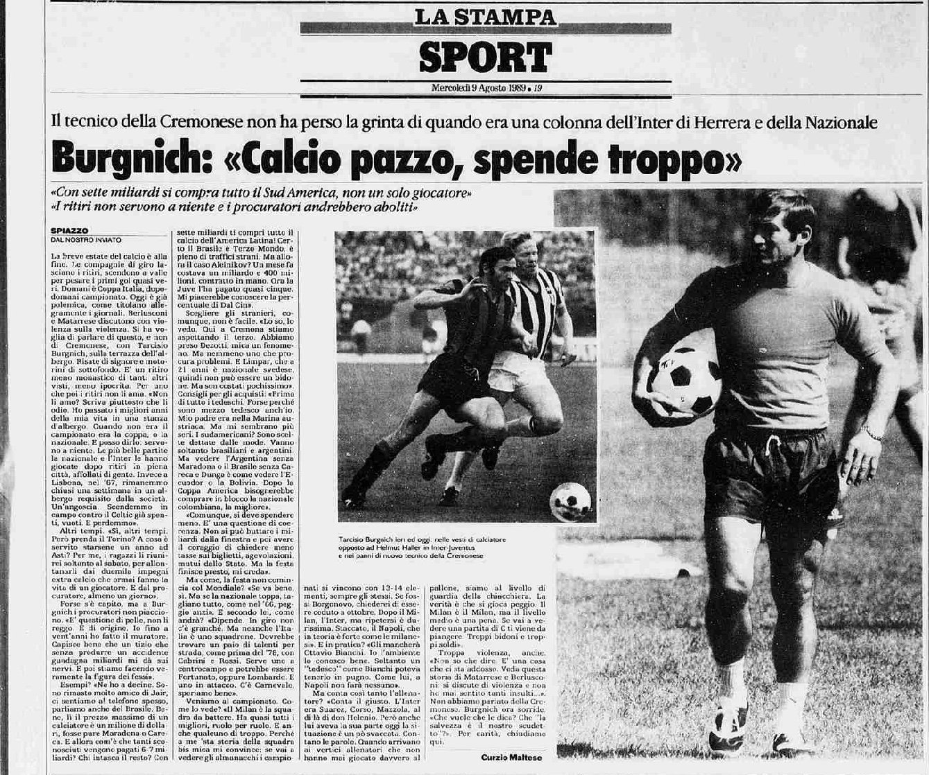 Come affascinante è questa intervista a firma Curzio Maltese a Tarcisio Burgnich per La Stampa del 9 agosto 1989.