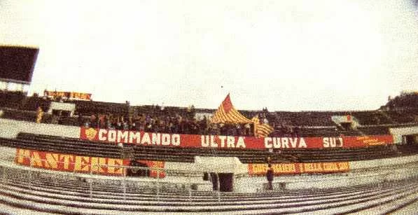 Così quindi il 9 gennaio 1977 in occasione di Roma – Sampdoria (3-0, rete di Musiello e doppietta di Di Bartolomei) appare per la prima volta sul muretto della Sud lo striscione di 43 metri del COMMANDO ULTRA’ CURVA SUD: a sinistra della scritta fa bella vista lo “scudo” ufficiale dell’As Roma e, sulla destra, la dicitura Centro Giovanile Giallorosso. “Tutto il materiale in dotazione ai gruppi fondatori fu messo a disposizione del Commando che fu omaggiato di qualche nuovo tamburo anche da parte del Centro Coordinamento. È innegabile che, all’inizio, i ragazzi della curva si giovarono della fiducia e dell’aiuto disinteressato di alcune “persone” che avevano sposato “in toto” la nascita del CUCS….La frase “Centro Giovanile Giallorosso” sui due striscioni (ci si riferisce a quello del Commando e a quello dei Guerriglieri) era dovuta al fatto che i due gruppi dovevano rappresentare un polo di attrazione di tutti quei ragazzi presenti in curva e che, nell’idea del Centro Coordinamento Roma Clubs, avrebbero potuto garantire un salto qualitativo per il tifo giallorosso” (Cit. Quando l’inno si alzerà, autoproduzione de “La Vecchia Guardia”, 2011).