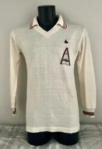 Questa è una bellissima e semplice maglia da trasferta a manica lunga. È in acrilico pesante e prodotta dalla ICOS, un maglificio che ha prodotto tante maglie per diversi club siciliani. La maglia è priva di sponsor commerciale ma reca nella parte superiore di sinistra lo stemma del club, rappresentato da una “A” stampata in vernicetta granata all’interno del quale sono raffigurati i tre faraglioni, simbolo della cittadina etnea al di sopra dei quali appare una figura (verosimilmente l’Etna) che si staglia all’orizzonte dove troviamo un sole di colore rosso. Leggermente più al di sopra dello stemma del club, ecco il logo della ICOS, rappresentato da un elefantino stilizzato, chiaro riferimento al “Liotru” simbolo della città di Catania. La maglia presenta poi degli inserti granata molto simili a quelli che compaiono sulle maglie Ennerre: si tratta di tre strisce orizzontali che sono presenti sia sul colletto che sui polsini.