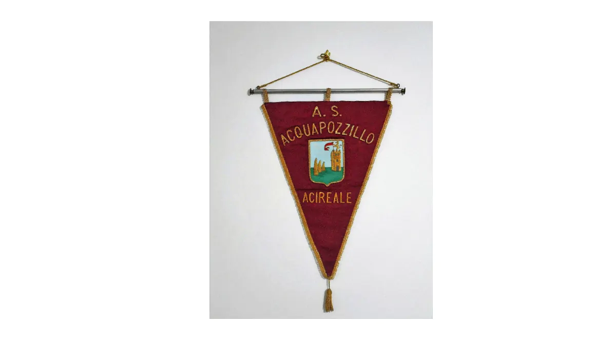 Questo gagliardetto consente anche di avventurarsi nell’araldica degli stemmi per dare spiegazioni sui simboli su scudo sannitico che hanno caratterizzato i gagliardetti usati dall’Acireale in varie stagioni, oltre a quelli riportanti l’iconica lettera “A”. Si tratta dei noti faraglioni ciclopici siti davanti al borgo marinaro di Aci Trezza e della rocca, sormontata dal leone, rappresentativa del “castrum” di Aci Castello.
