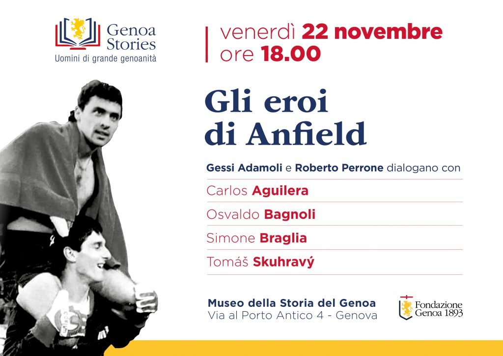 Attraverso una serie di incontri dal titolo “Genoa Stories, uomini di grande Genoanità“ inizia un percorso nella storia della squadra rossoblù. Come si apprende dal sito della Fondazione Genoa infatti “Memoria e orgoglio rappresentano il filo invisibile che unisce il popolo rossoblù. La Fondazione Genoa, fedele custode dei valori di una tifoseria speciale, ha così elaborato un vero e proprio viaggio nella memoria. Sono previsti, con cadenza mensile, dodici appuntamenti, ma altri se ne potranno aggiungere al termine del primo ciclo di incontri. La location non poteva che essere il Museo della Storia del Genoa, straordinario raccoglitore di cimeli e testimonianze del club più antico d’Italia. A stimolare i protagonisti a ricordare attraverso racconti, aneddoti, retroscena e a provare anche a svelare qualche mistero ancora irrisolto di quell’ affascinante romanzo popolare che è la storia del Genoa sarà Gessi Adamoli che, prima da tifoso e poi da giornalista, ha seguito in prima persona gli ultimi anni 50 anni del Grifone. Sarà di volta in volta affiancato da un collega, una grande firma che spesso coincide anche con l’essere un grande genoano. Tra gli altri Franco Manzitti, Massimo Donelli, Roberto Perrone, Giampiero Timossi, Pinuccio Brenzini, Giovanni Porcella, Giorgio Cimbrico e Edoardo Bozano.