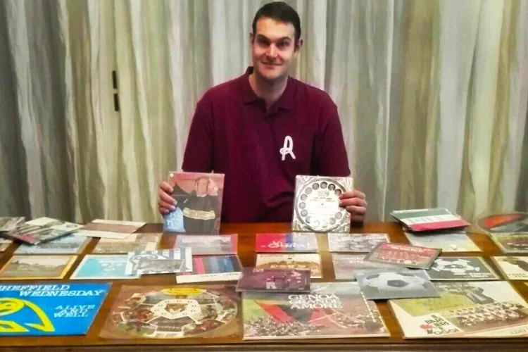 Alessandro è di Vicenza ha trentacinque anni per 199 cm di altezza. Laureato in Scienze Storiche a Padova ora segue Demo Etno Antropologia a Venezia. Nel frattempo gestisce un Bed & Breakfast e collabora con “Radio Vicenza” dove cura una rubrica sulla storia del calcio e presenta gli avversari di turno del Lanerossi rifacendosi ai precedenti storici. Se tutto ciò non bastasse, è anche un grandissimo conoscitore della storia militare. Alessandro, da ragazzo, ha giocato “tra i pali” e questa passione per il calcio l’ha portato a studiare le sue storie, anche quelle più particolari e sconosciute ai più. Potremmo ascoltarlo per ore su tantissimi argomenti ma decidiamo di farci raccontare “solo” la sua passione per i vinili relativi alle squadre di calcio. Senza dimenticare che possiede anche oltre 1.000 libri con i quali ha ricostruito la storia delle sponsorizzazioni e dei fornitori sportivi nel mondo del calcio dal 1962 a oggi. Insomma siamo di fronte ad una “Enciclopedia del Calcio”.