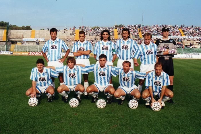 Il Pescara che si appresta a disputare il campionato di serie B 1993-94 è una squadra del tutto ridimensionata da quella che appena due stagioni prima aveva dominato la serie B con Galeone in panchina e Massimiliano Allegri guida in mezzo al campo, ma retrocesso immediatamente al termine di un’annata, quella 1992-93, con l’ultimo posto occupato in pratica da inizio a fine torneo. Nell’estate del 1993 in riva all’Adriatico, nonostante le premesse di una nuova stagione da protagonisti, si abbatte come una mannaia la pesantissima onta dell’illecito sportivo: per una gara relativa a due anni prima (14 giugno 1992) contro il Taranto, infatti, finita nel mirino della procura, il Pescara viene penalizzato di 3 punti da scontare all’inizio del campionato 1993-94, mentre il tecnico Galeone squalificato. Il Taranto aveva vinto quella partita per 2-1 ottenendo la salvezza, ma alcune intercettazioni fra lo stesso Galeone ed una sua amica in cui venivano fatti chiari riferimenti a combine fra le due squadre, avevano gettato ombre e sospetti sulla gara in questione, sino alla decisione finale di penalizzare entrambe le società.