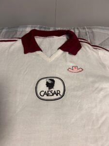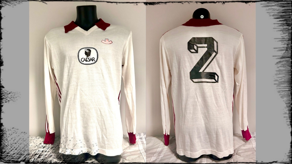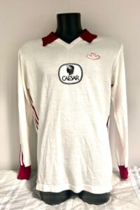 Al centro della maglia troviamo stampato lo sponsor commerciale, Caesar, raffigurante una testa nera stilizzata con alloro, per simboleggiare appunto la figura degli antichi imperatori romani. Questo sponsor fu sulle maglie amaranto per la sola prima parte del campionato 82/83, essendo poi sostituito dal marchio calzaturiero “Soldini”. Sul retro-maglia, il numero è di colore nero, in plastica pesante e termoapplicato.