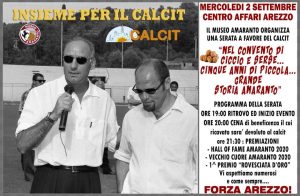 “Appuntamento mercoledi 2 settembre, Centro Affari e Convegni. Insieme al Calcit Arezzo festeggeremo uno dei periodi più belli dell’Arezzo Calcio”. Questo il messaggio che si può leggere sulla pagina Facebook Museo Amaranto – Storia dell’Arezzo Calcio, una serata in cui si ripercorreranno gli anni dal 1996 al 2000, da Sansepolcro ad Ancona passando per Pistoia. Una Storia che sarà rivissuta mercoledì sera durante la Serata del Museo Amaranto con i protagonisti di allora. “Nel Convento di Ciccio e Serse” è il nome della serata, denominazione coniata dal giornalista Giorgio Ciofini in un periodo contraddistinto da ristrettezze economiche dove la società amaranto passò alla storia appunto come il Convento di frate Ciccio che pagava due noci per gli ingaggi dei calciatori.