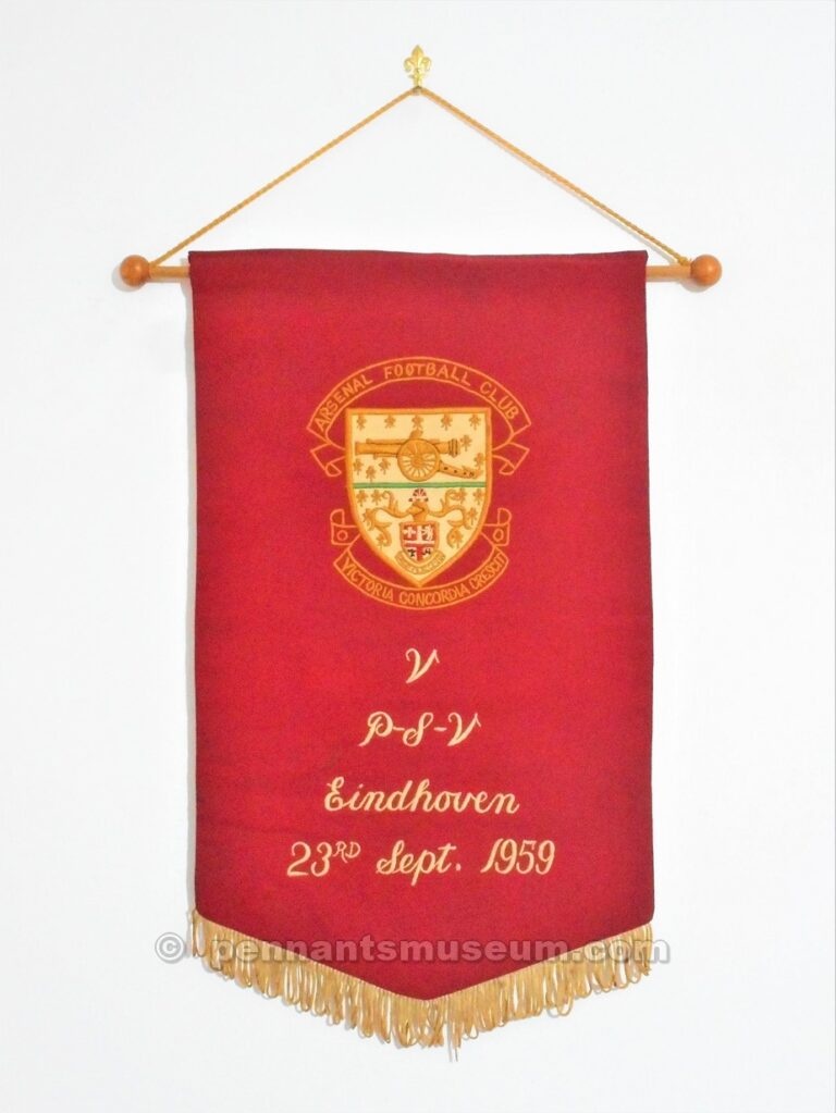 PENNANTSMUSEUM.COM – Il gagliardetto è quello che il capitano dell’Arsenal consegnò agli avversari del P.S.V. Eindhoven in occasione di un incontro amichevole giocato il 23 settembre 1959. Due curiosità legata al gagliardetto e agli avversari della formazione londinese. All’Arsenal è storicamente accostato il soprannome di “gunners” ossia artiglieri. Lo stemma presente nel gagliardetto ne è testimone. Bisogna risalire alle origini del club per comprenderne la spiegazione. Infatti i fondatori della squadra erano un gruppo di operai della Royal Arsenal, sita nel quartiere di Woolwich a Londra, preposta alla realizzazione di artiglierie per l’Esercito inglese. Ne è testimonianza di ciò anche il primo stemma della squadra che riportava il disegno di tre bocche da fuoco affiancate, simbolo tratto da quello del quartiere di Woolwich.